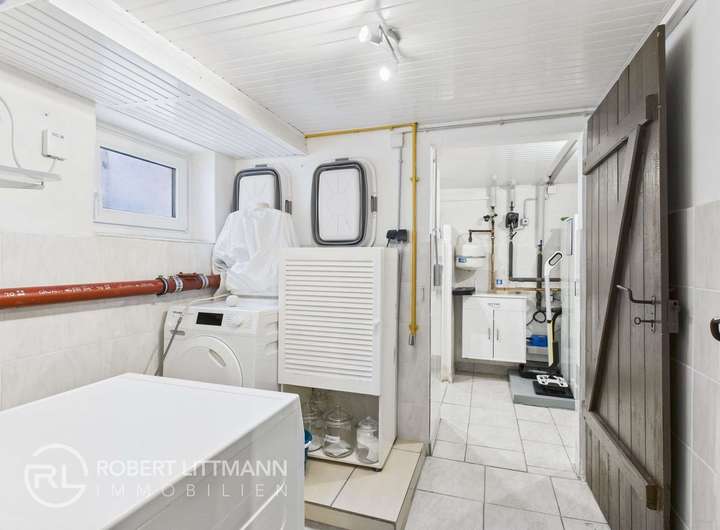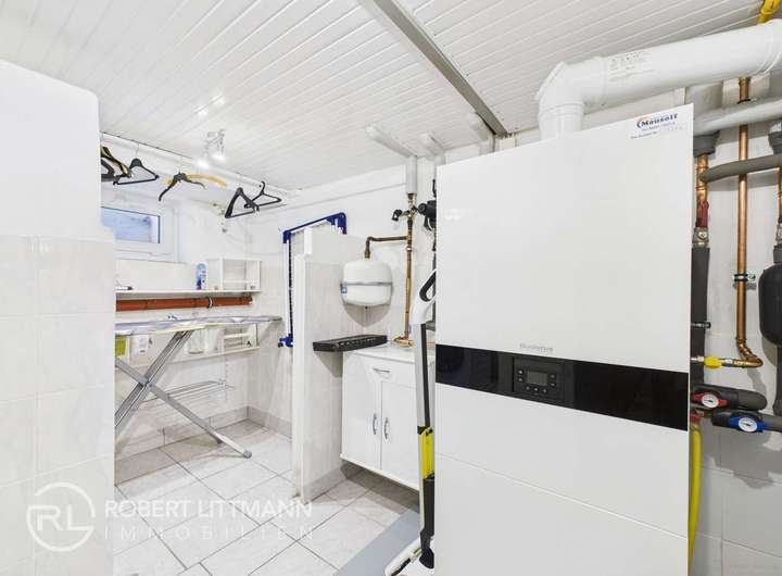 Von der Küche aus führt eine Treppe in den Vollkeller, der vielseitig nutzbar ist – derzeit unteranderem als Arbeitszimmer eingerichtet. Außerdem befinden sich hier der Heizungsbereich mit einer gepflegten Gas-Heizung der Marke Buderus aus dem Jahr 2021 sowie Anschlüsse für Waschmaschine und Trockner.