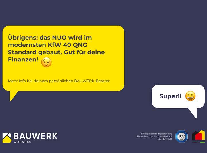 Das NUO steht für nachhaltiges, effizientes und zukunftsfähiges Bauen: Mit dem KfW 40 QNG Standard, einer modernen Wärmepumpe, optimaler Dämmung und einer Photovoltaikanlage auf dem Dach, setzt es neue Maßstäbe für energetische Verantwortung und niedrige Betriebskosten.
