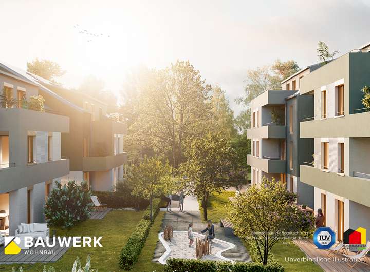 Im Inneren des Ensembles liegt das grüne Herz des Projekts – ein großzügiger Gartenhof mit schönem Baumbestand, Sitzmöglichkeiten und Platz für Begegnung.