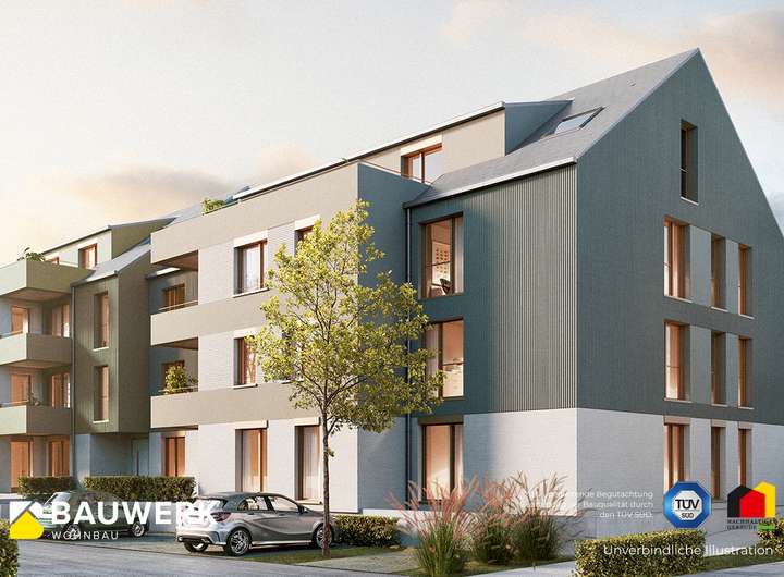 Die Gebäude sind drei bis vier Geschosse hoch und bieten teilweise weite Ausblicke über die Dächer Nufringens bis hin zum bewaldeten Hügel am Horizont. Im Erdgegeschoss liegen Wohnungen mit privaten Gartenanteilen, darüber moderne Etagenwohnungen mit hellen, klaren Grundrissen.