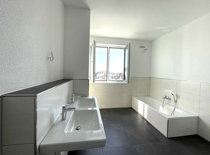 + Badezimmer mit Badewanne, Dusche, Fenster und Waschmaschinen-Anschluß.