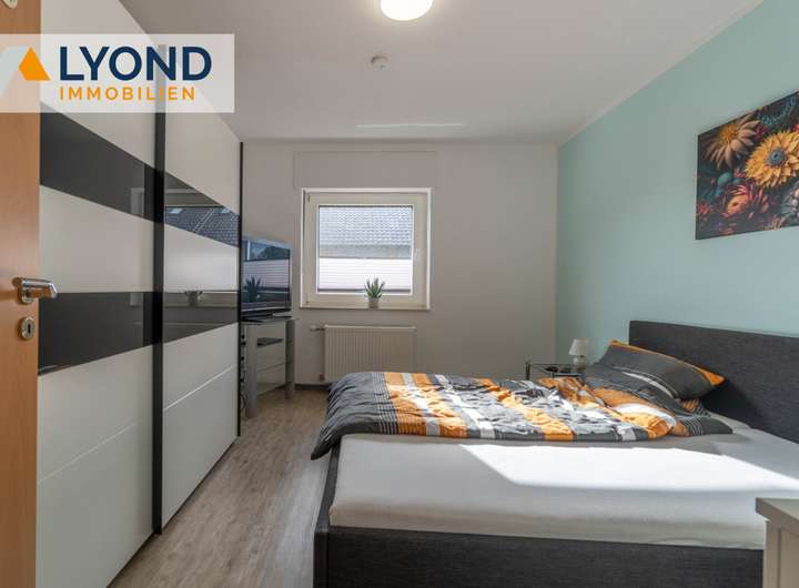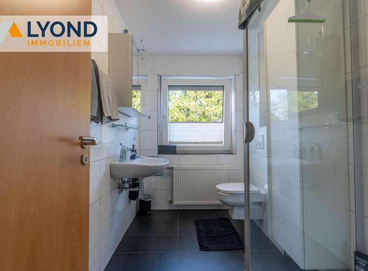 Die Obergeschosswohnung verfügt ebenfalls über ca. 85 m² Wohnfläche mit einem Wohnzimmer, drei Schlafzimmern, einer Küche, einem Duschbad und einem Hauswirtschaftsraum. Ein 2017 sanierter Balkon sorgt für zusätzlichen Freiraum. Die Rollläden im Obergeschoss sind manuell bedienbar.