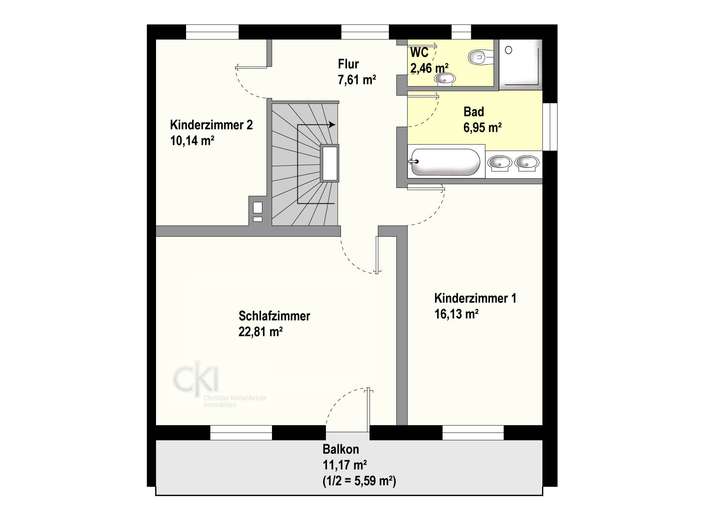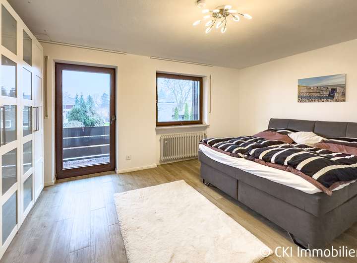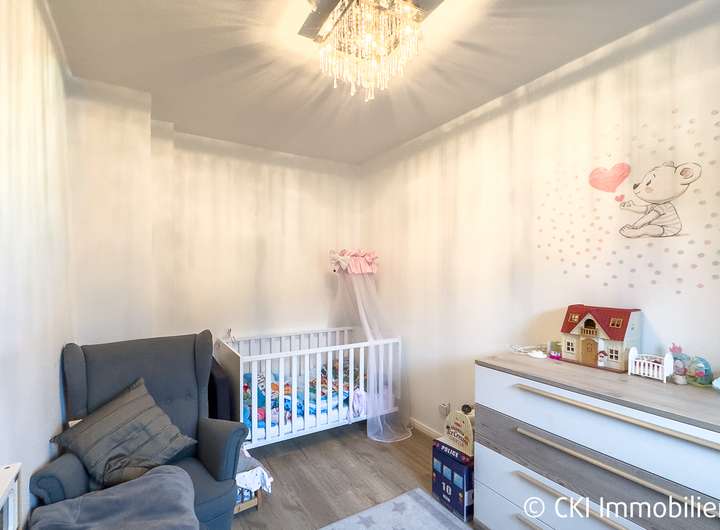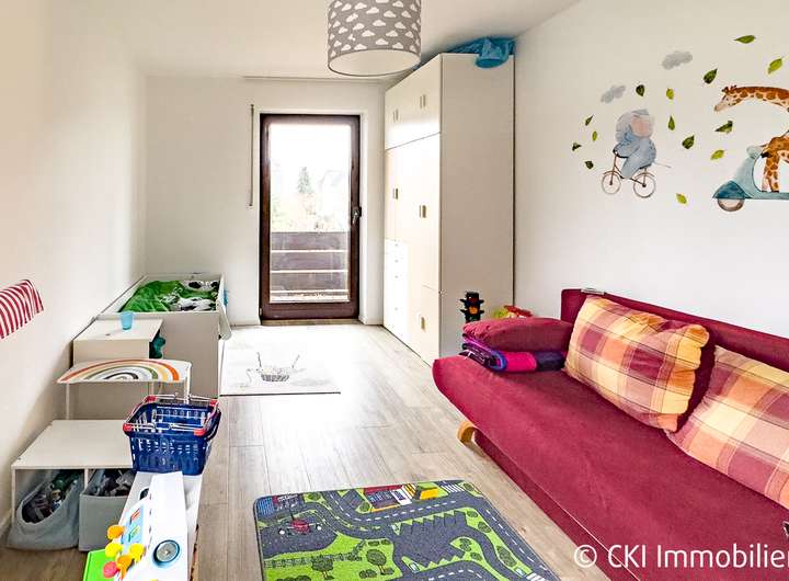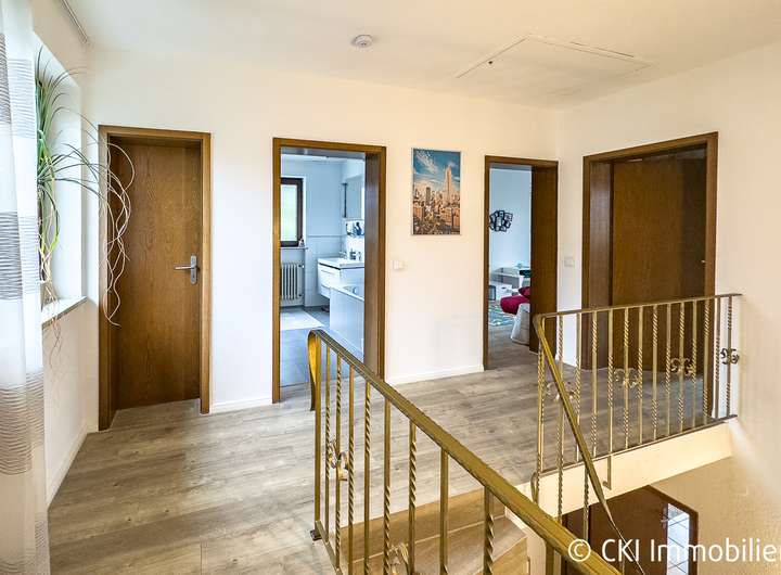 Im Obergeschoss befinden sich drei Zimmer, die sich ideal als Schlafzimmer und Kinderzimmer anbieten, ein modernisiertes Bad mit Badewanne, bodentiefer Dusche, Fenster sowie ein separates WC. Zwei der Zimmer bieten Zugang zum nach Süden ausgerichteten Balkon.