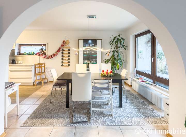 Mittelpunkt des Hauses ist der offene Wohn-Ess-Küchenbereich. Das nach Süden ausgerichtete Wohnzimmer mit Zugang zur Terrasse und dem angrenzenden Garten verfügt über einen Kamin und ist mit dem Essbereich verbunden. Der Essbereich bildet eine Einheit mit der offenen Küche mit angeschlossener Speisekammer. Die Einbauküche kann von den Vormietern abgelöst werden. Der Flur bietet viel Platz für einen einladenden Eingangsbereich mit Garderobe und einen weiteren Zugang zur Küche. Ein Gästezimmer oder Büro sowie ein Gäste-WC komplettiert die Fläche im Erdgeschoss.