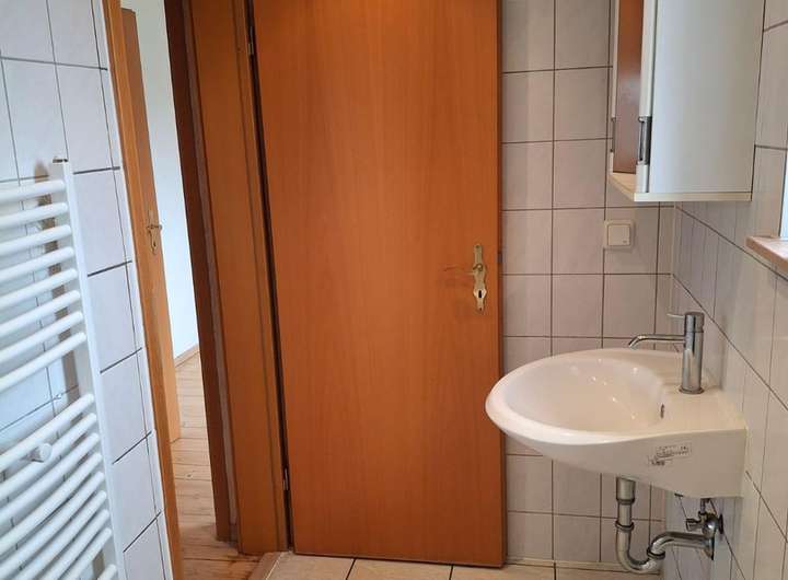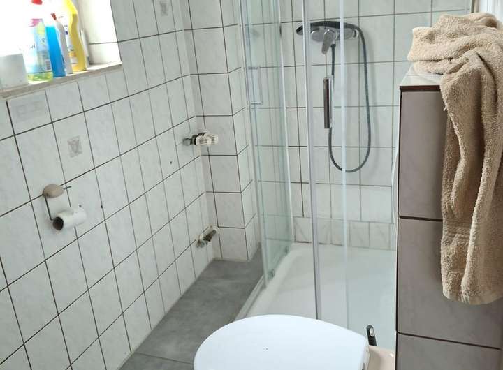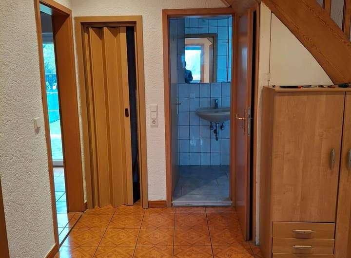 Im Erdgeschoss befindet sich eine Toilette mit Dusche. Auch dieser Boden hat Fußbodenheizung.