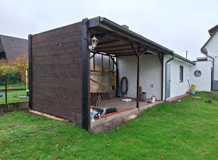 Hinter dem Haus ist noch ein Carport, wo man z. B. Fahrräder abstellen, Holz für den Kamin oder seine Werkzeuge für den Garten lagern kann.