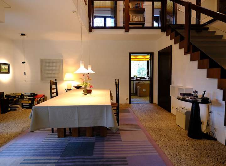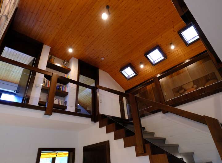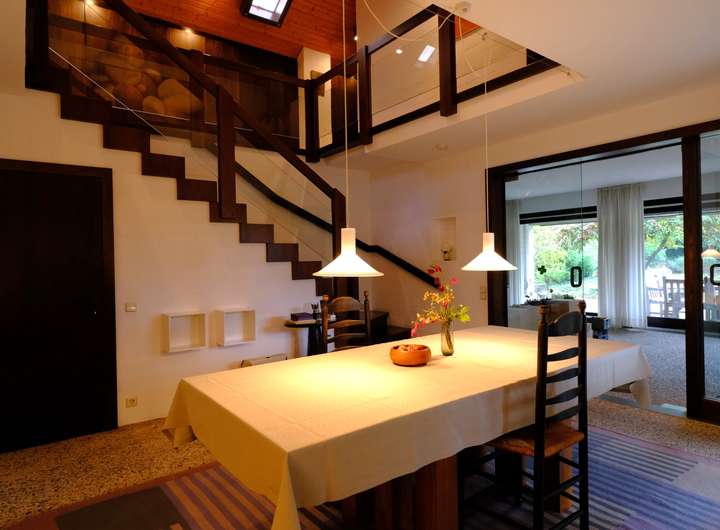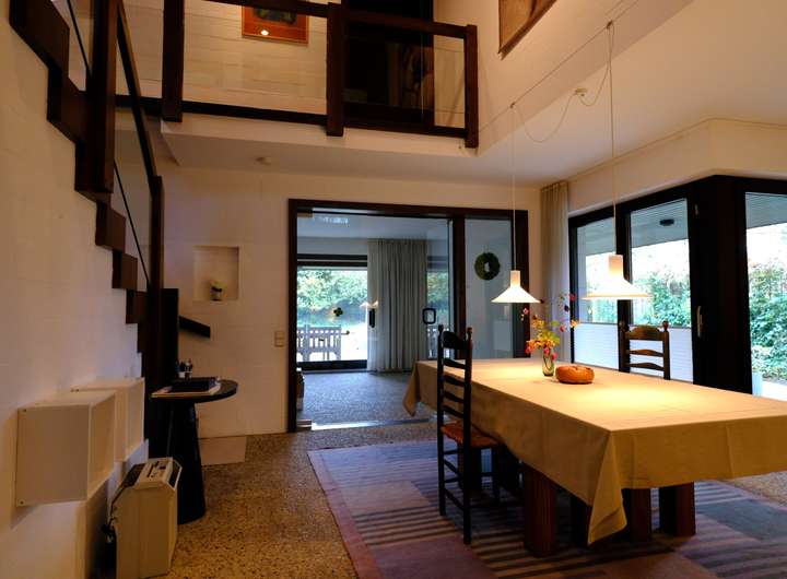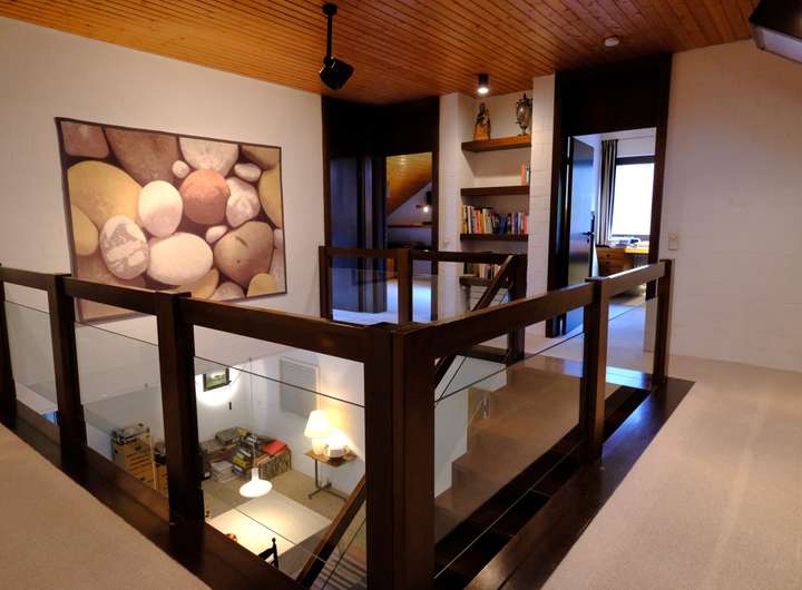 Durch die Raumaufteilung mit einem zentralen Wohn-/Esszimmer, das über einen Luftraum mit umlaufender Empore verfügt, hat das Haus einen einzigartigen Charakter.