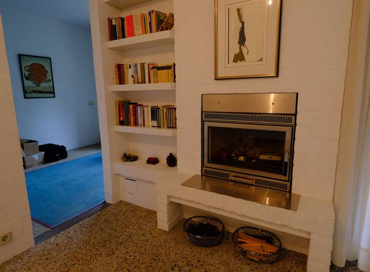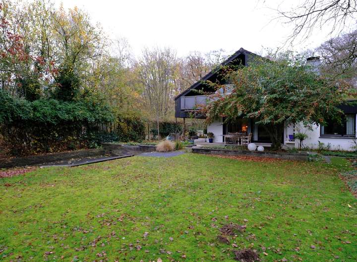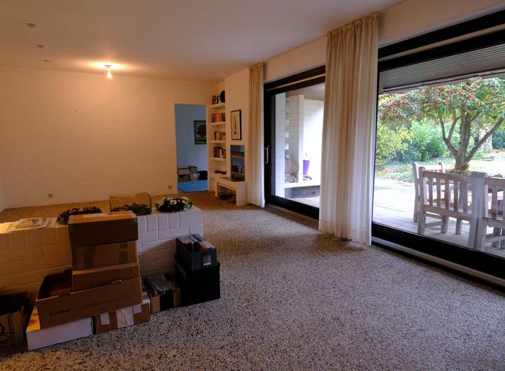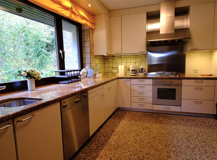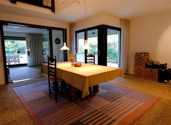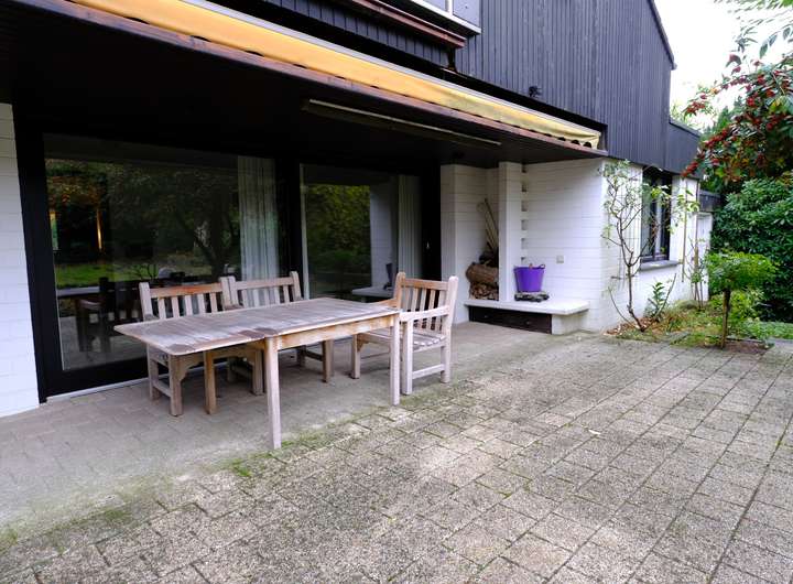Im einladend gestalteten Eingangsbereich befinden sich eine Garderobe, ein Gäste-WC und der Zugang zum Keller. Dabeben liegt die Küche, die über Einbaugeräte, eine Arbeitsplatte aus Granit und einen wunderschönen Blick auf den Wald verfügt. Ein weiterer Raum schließt sich an die Küche an. Das Herzstück des Erdgeschosses ist der große zentrale Raum, der durch seine Öffnung zum Dachgeschoss hell und repräsentativ ist und Zugang zur Terrasse und dem Hauptwohnraum ermöglicht. Dieser Wohnraum verfügt über große Fenster zum Garten und einen Kaminofen. Erweitert wird der Wohnraum durch ein kleineres Zimmer mit einem fest eingebauten Sitzplatz. Die große Terrasse ist teilweise überdacht und verfügt zusätzlich über eine Markise.