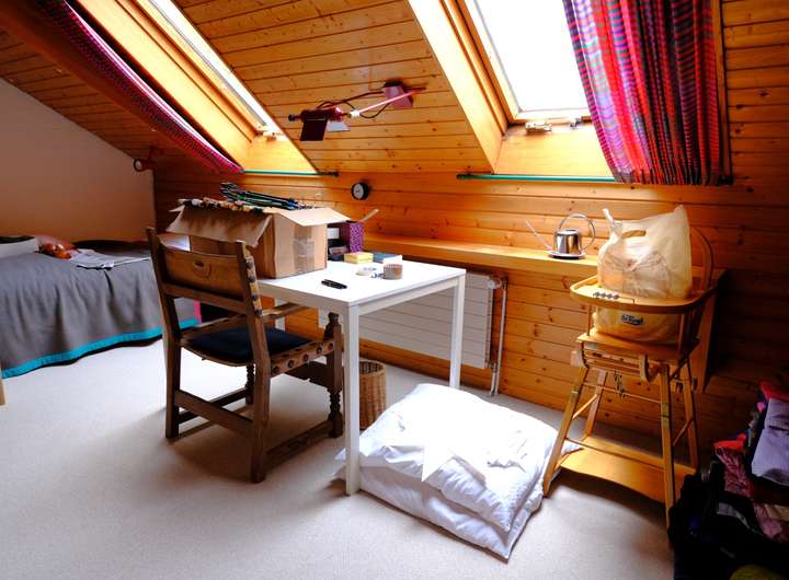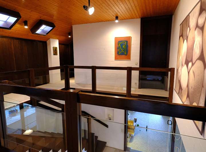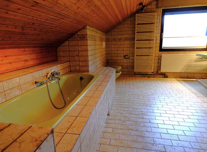 An einer Empore gelegen befinden sich im Obergeschoss vier helle Räume und ein großes Badezimmer, das mit Sauna, Badewanne, Dusche, Toilette und Bidet ausgestattet ist. Daneben gibt es noch eine zusätzliche separate Toilette.