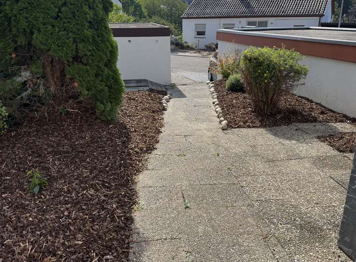 Der eingezäunte Garten bietet ein kleines Gartentor, das direkt zu einem Kinderspielplatz und ins Grüne führt – ideal für Familien mit Kindern.