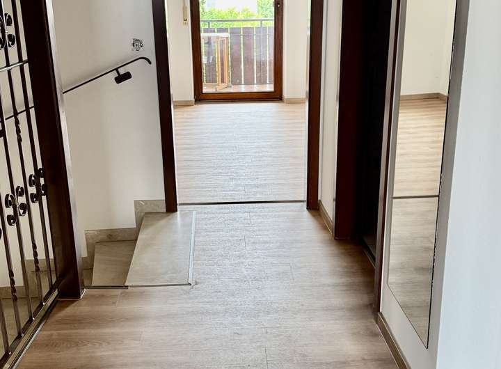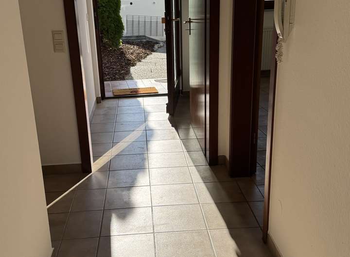 Über den einladenden Eingangsbereich gelangen Sie rechts zum Gäste-WC und links in den großzügigen Küchenbereich, der ausreichend Platz für einen Essbereich bietet.