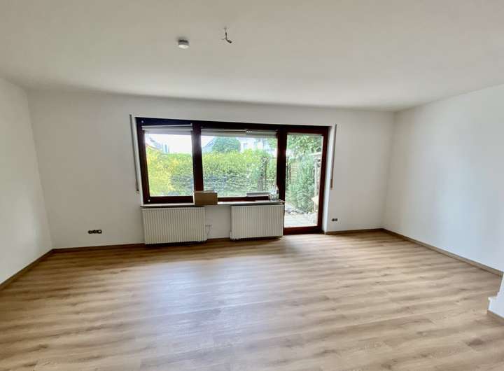 Das helle Wohnzimmer mit großen Fenstern öffnet sich zur Terrasse und zum eingezäunten Garten – perfekt für gemütliche Stunden im Freien.