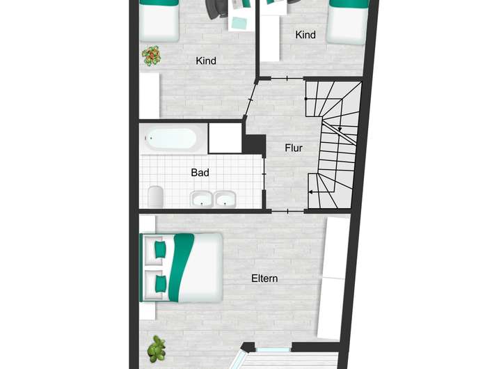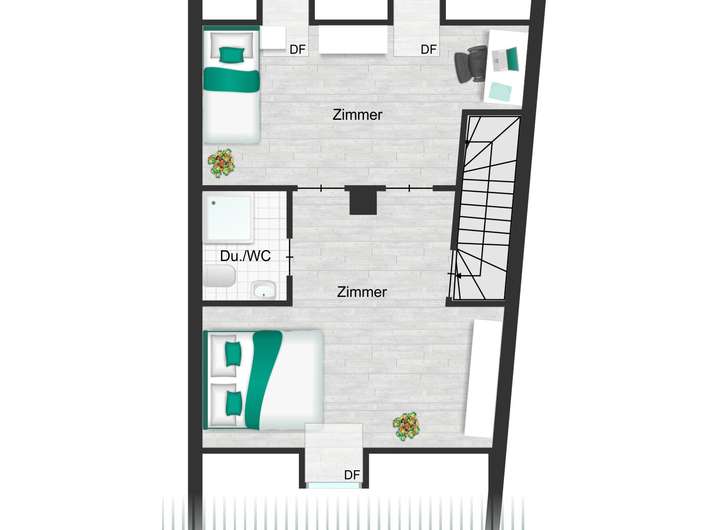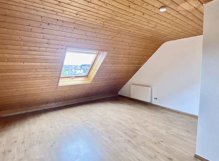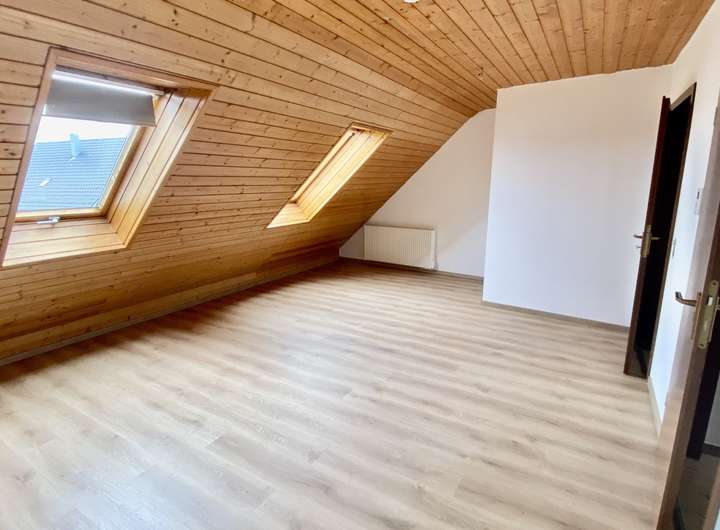 Das 2. Obergeschoss bietet zwei große, ausgebaute Dachzimmer sowie ein modernes Duschbad – ideal als Jugend- oder Arbeitsbereich.