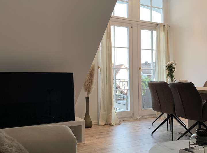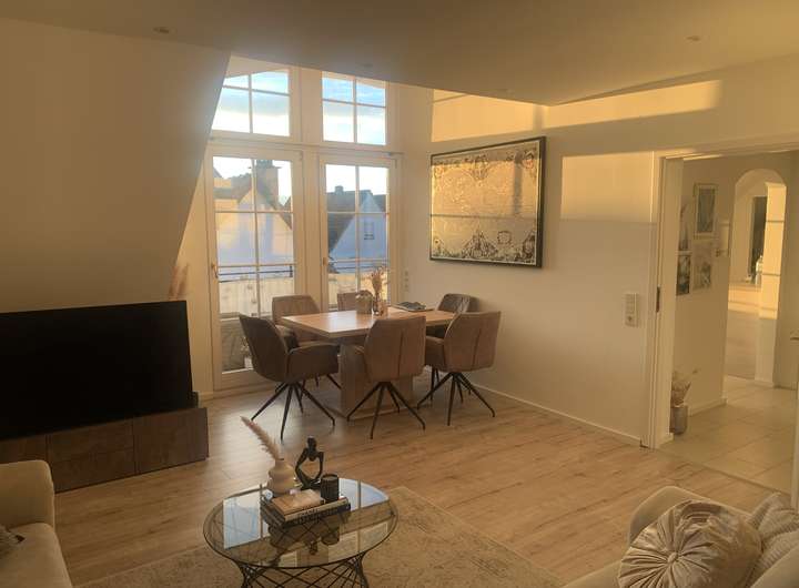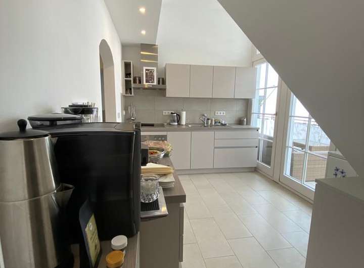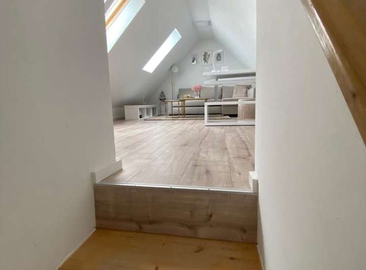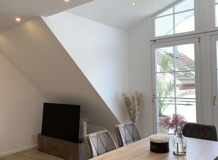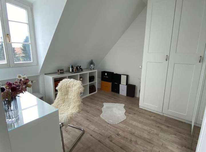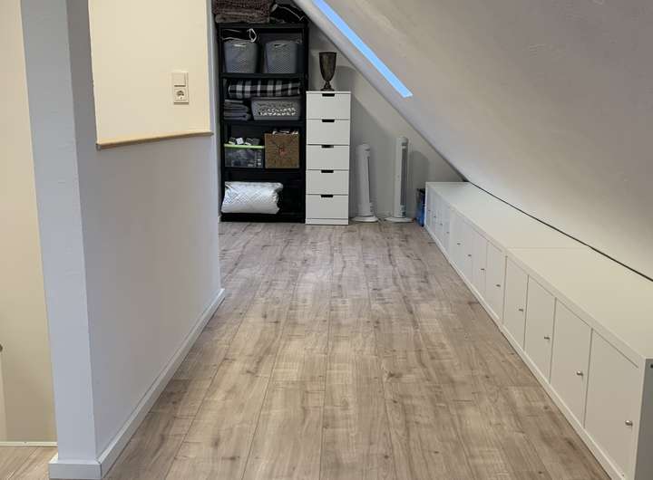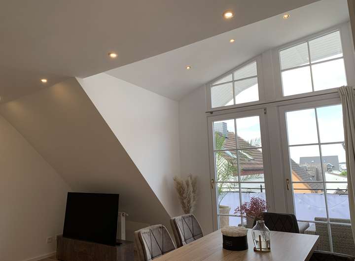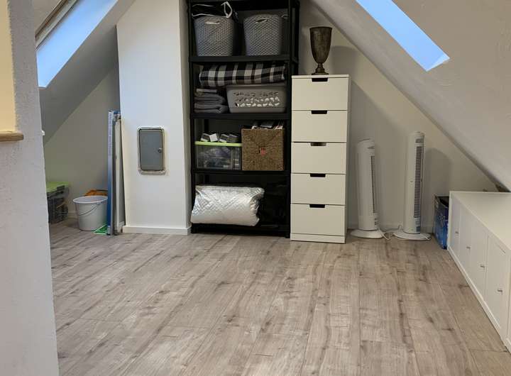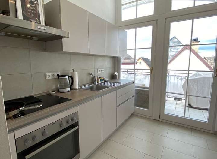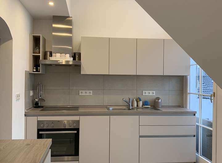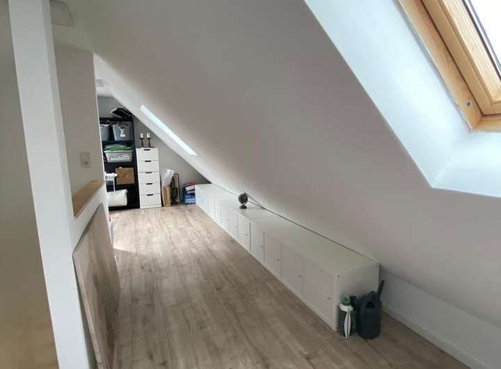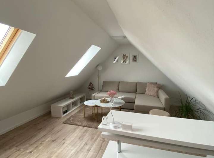 Diese lichtdurchflutete Maisonettewohnung befindet sich in einem gepflegten Mehrfamilienhaus aus dem Jahr 2002 mit nur vier Parteien und wurde wunderschön renoviert/ modernisiert in 2019. Sie besticht durch einen hellen, stilvoll eingerichteten Wohnraum und eine durchdachte Raumaufteilung auf zwei Ebenen. Die untere Ebene bietet eine großzügige Küche mit Einbauküche und Abstellkammer sowie Zugang zur Sonnenterrasse. Zwei kleinere Zimmer mit jeweils ca. 10 m² eignen sich ideal als Schlaf- und Ankleidezimmer. Das Wohnzimmer mit ca. 18 m² ist lichtdurchflutet dank bodentiefer Fenster und bietet ebenfalls Zugang zur Sonnenterrasse, welche im Sommer zum Grillen und sonnenbaden einlädt. Zwei vollwertige Badezimmer - eines mit Dusche, das andere mit Badewanne - runden das Raumangebot ab. Das gedämmte Dachstudio mit ca. 28 m² bietet zusätzlichen Platz, ist aktuell als Büro und Gästezimmer genutzt, und verfügt zusätzlich im hinteren Bereich über reichlich Stauraum. Das Dachgeschoss beinhaltet alle Anschlüsse wie Wasser, Gas & Strom und kann somit bei Bedarf auch als vollwertiger Wohnraum genutzt werden (eigene getrennte Wohnung mit eigener Küche & Bad). Ein Kellerabteil ist zudem vorhanden und eine praktische Garage steht ebenfalls zur Verfügung, die genug Platz für große Autos bietet. Diese Maisonettewohnung überzeugt durch ihre hochwertige Ausstattung, die praktische Aufteilung und den hellen, einladenden Charakter - perfekt für anspruchsvolle Käufer, die ein modernes und stilvolles Zuhause schätzen.