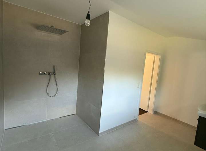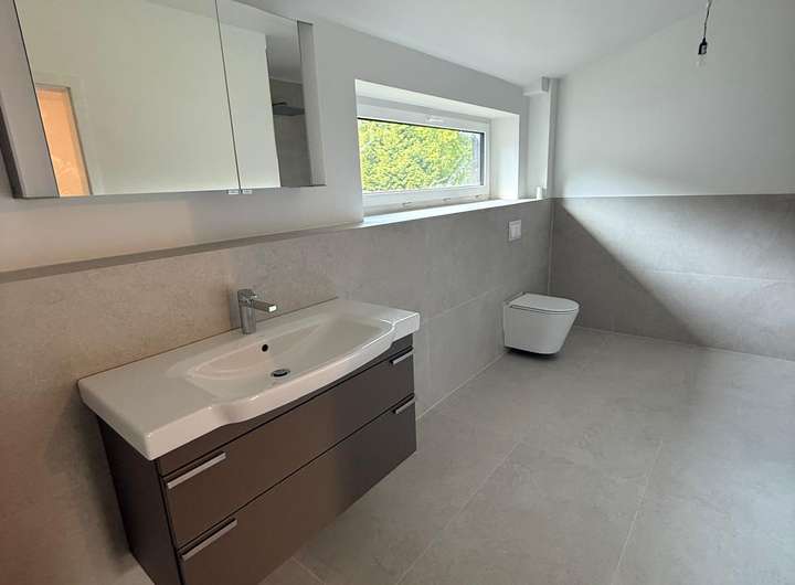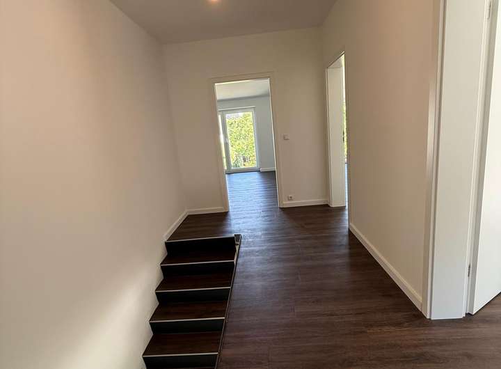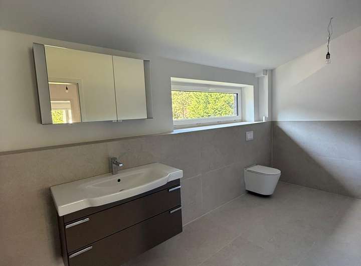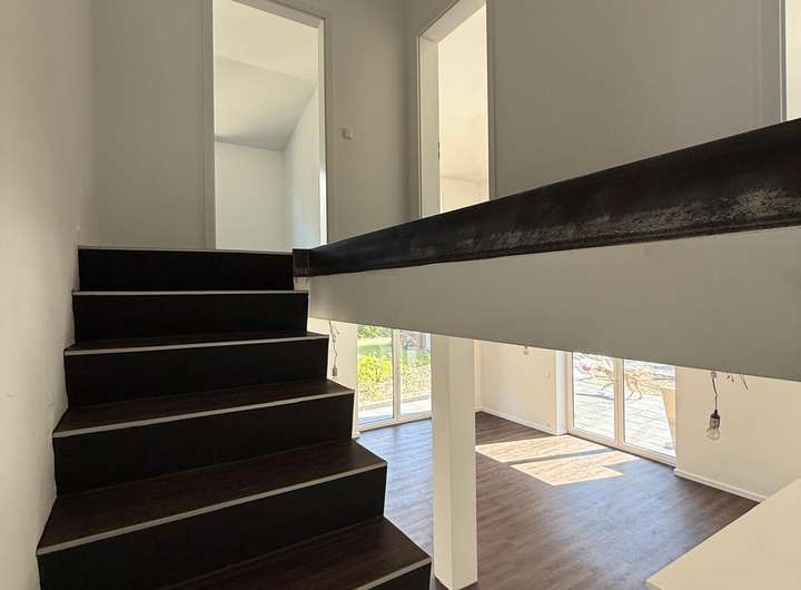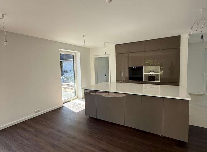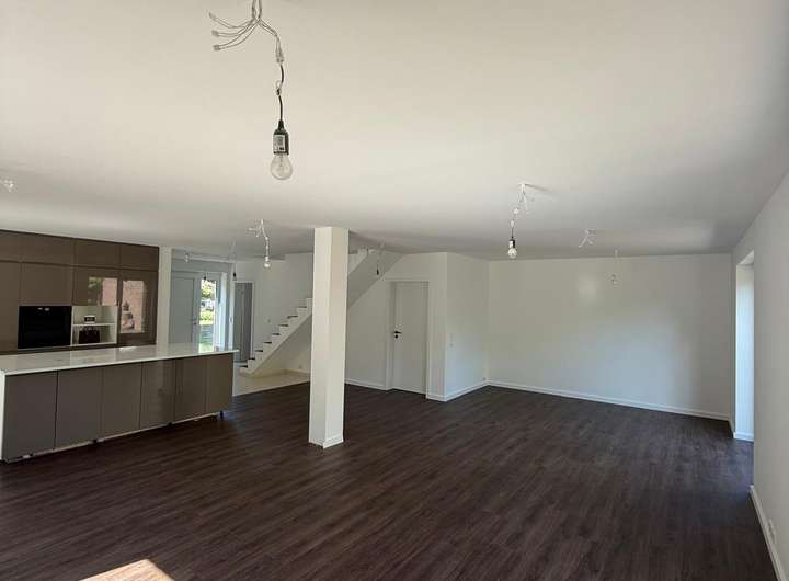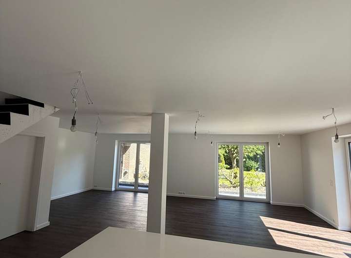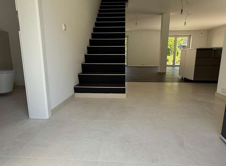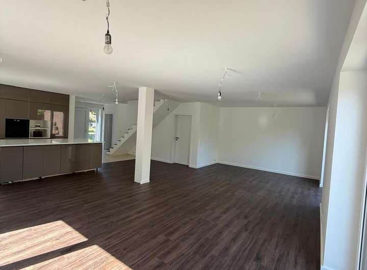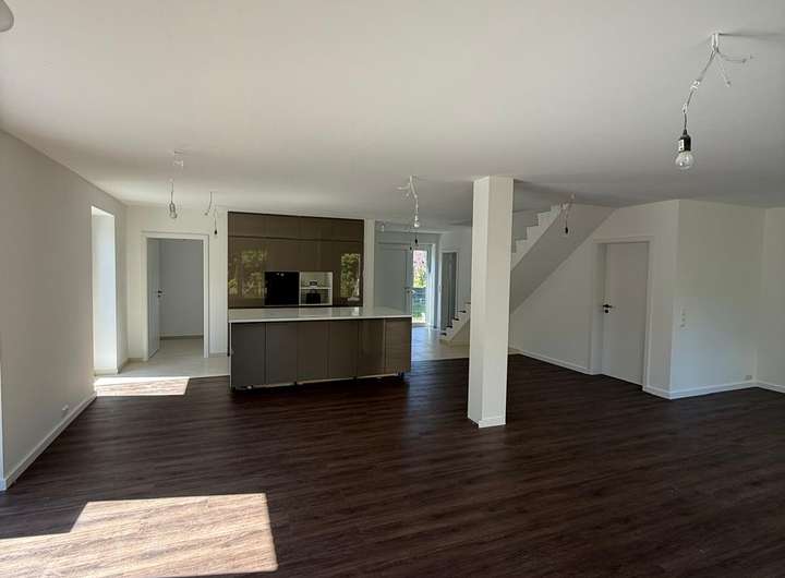 Wir vermieten eine Doppelhaushälfte zum Erstbezug. Das Haus befindet sich in den Endzügen des Baus. Im Erdgeschoss befindet sich ein großzügiger Eingangsbereich, eine offene Küche mit großer Kochinsel, ein offenes Ess- sowie Wohnzimmer und ein Gäste-WC sowie ein Hauswirtschaftsraum und ein Elektroraum. Im 1. OG befindet sich ein sehr helles Bad sowie ein Schlafzimmer mit Ankleidezimmer und 2 Kinderzimmer. Alle Zimmer sind sehr hell durch die großen Fenster. Das Haus hat insgesamt 4 Zimmer.