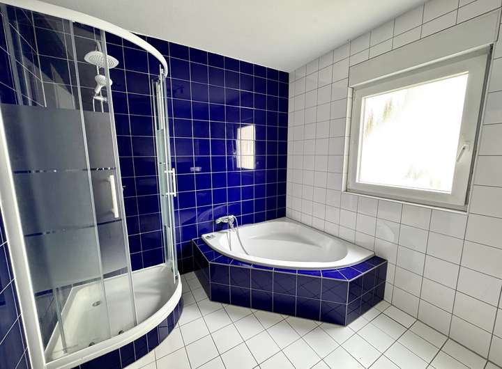 OG: Bad mit Wanne, Dusche, WC, Waschbecken deckenhoch gefliest – mit Fenster