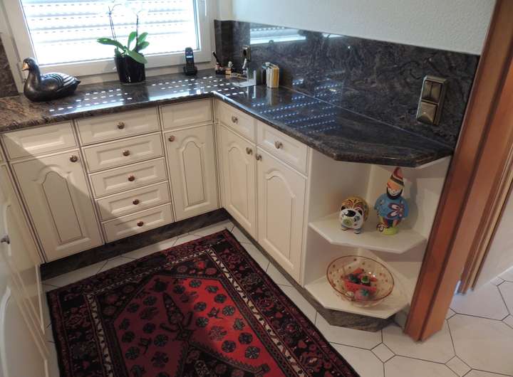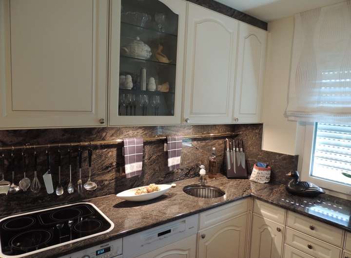 Eine Miele Einbauküche mit Granitarbeitsplatte und Granitverkleidung, der gegenüber liegende Essbereich, Flur und Gäste-WC vervollständigen diese Etage.