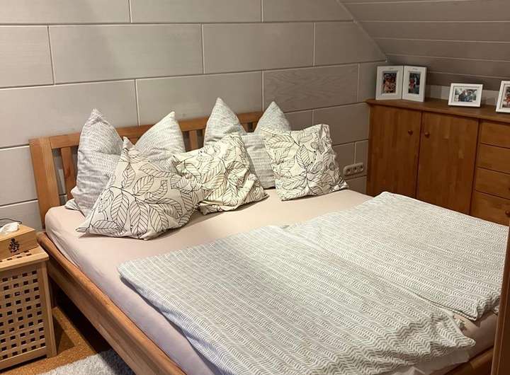 Eine Holztreppe führt Sie in das Obergeschoss.