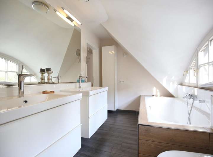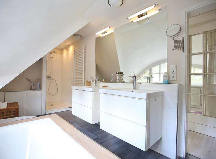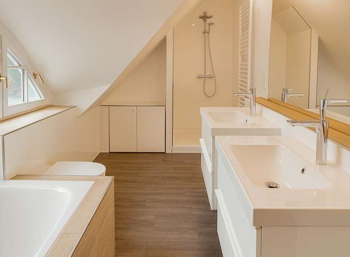 Im Obergeschoss befinden sich der Schlafbereich sowie ein weiterer Raum, der sich ideal als Arbeits-, Gäste- oder Ankleidezimmer eignet. Ein hochwertiges Vollbad mit Wanne, Dusche und Handtuchheizkörper rundet die Etage ab.