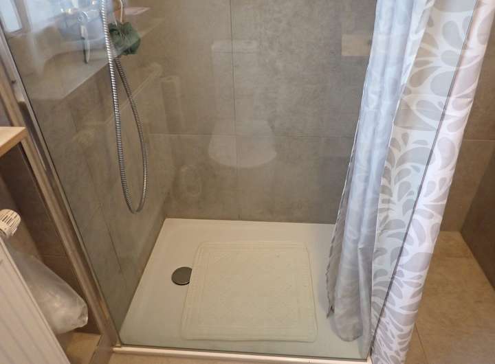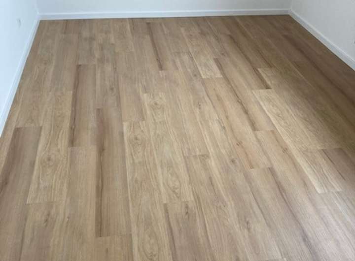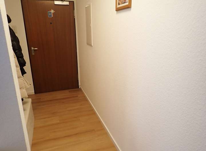 Die Bodenbeläge in den Wohnräumen und in der Küche sind mit Design Vinylboden ausgestattet. Das Bad ist mit modernen, grauen Fliesen und die Dusche mit einer Glastrennwand ausgestattet.