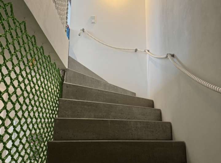 Die Innentreppen sind aus einer Stahlkonstruktion mit Sichtbetonstufen, unterseitig mit Gipskarton beplankt.