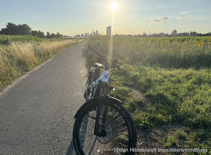 Mit dem Fahrrad fahren Sie durch die Oberräder Gärten am "Grüne Soße Denkmal" vorbei direkt in die Stadt.