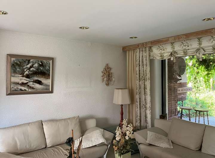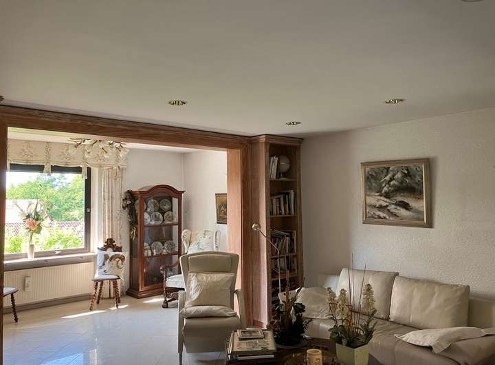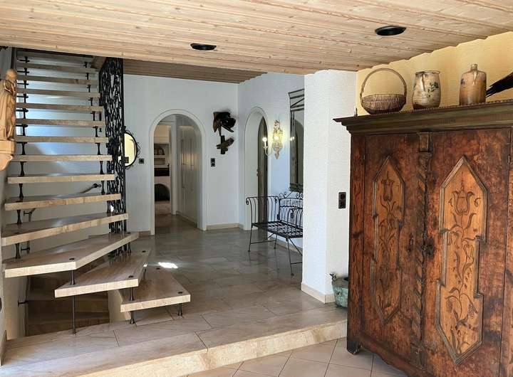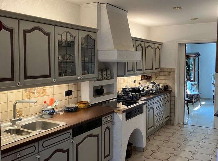 Hochwertige exkl. Ausstattung, Alarmanlage, getönte Aluminiumfenster mit elektr. Aluminium-Rollos, Marmortreppe, Marmorböden, Aussenkamin, Kachelofen, Neue Niedrigenergie-Ölzentralheizung, 30 qm großzügiges Entree, offenes Wohnen, Design-Innentüren, Landhausküche mit neuem Induktionskochfeld und neuem Backofen, schreinergefertigten Wohnzimmereinbauten aus gekälkten Pinienholz, Schlafzimmer mit hochwertigen Einbauten u. Balkon, Ankleidezimmer, Sauna, uvm.