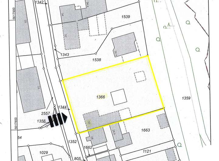 Das Grundstück ist an der Südseite aktuell mit einem einseitig angebauten Haus mit 134 m² Wohnfläche bebaut. Das Gebäude muss erhalten bleiben und darf nicht abgerissen werden.
