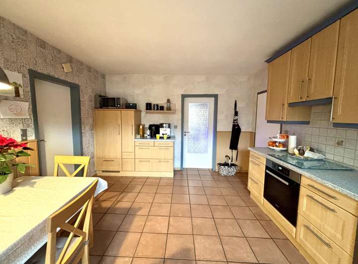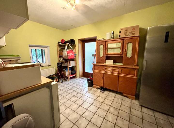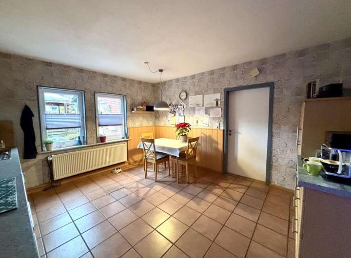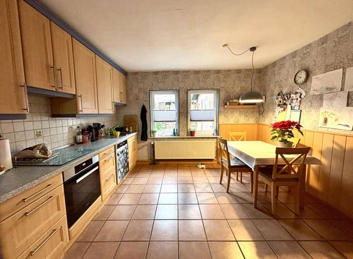 Das Wohnzimmer mit stilvollem Durchbruch und angrenzendem Essbereich wird vom voll funktionsfähigen Kaminofen (Einbau 2003) geprägt – ein gemütlicher Mittelpunkt für kühle Tage. Die große Wohnküche bietet nicht nur viel Platz zum Kochen und Verweilen, sondern verbindet weitere Zimmer auf charmant verwinkelte Weise miteinander. Hier findet jeder seinen Platz: ein Schlafzimmer, zwei vielseitig nutzbare Kinder-, Arbeits- oder Hobbyräume, sowie eine praktische Waschküche. Ein kleiner, bauzeittypischer Kellerraum beherbergt die Heizung.