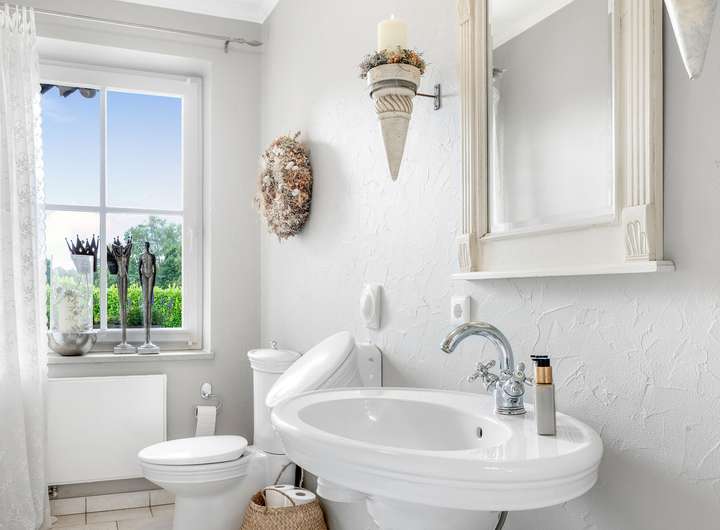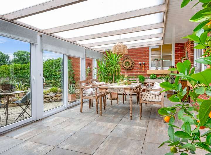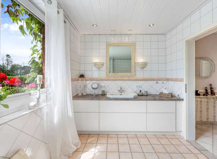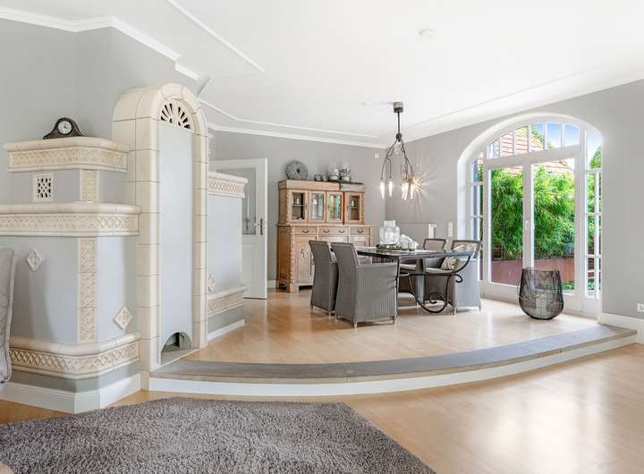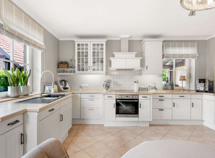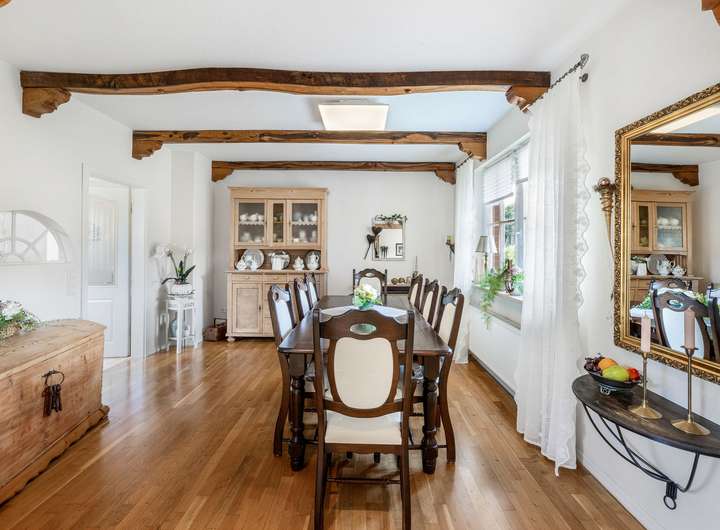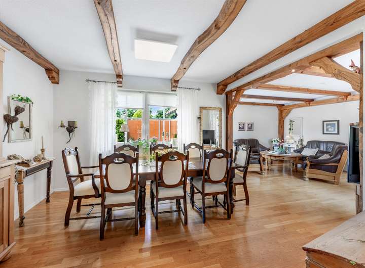 Das modernisierte Ursprungshaus aus dem Jahr 1956 verfügt im Erdgeschoss über einen lichtdurchfluteten (Kalt-)Wintergarten, der den Wohnraum mit dem Außenbereich verbindet. Das Wohn- und Esszimmer bietet großzügige Flächen, ergänzt durch ein separates Fernsehzimmer. Die moderne Einbauküche von 2016 ist im Kaufpreis enthalten und wird durch eine zusätzliche Hauswirtschaftsküche mit nostalgischem Ofen erweitert. Die Diele führt zu einem Gäste-WC, einem Schlafzimmer sowie zu einem Tageslichtbad mit Dusche, Eckbadewanne und Waschtisch.