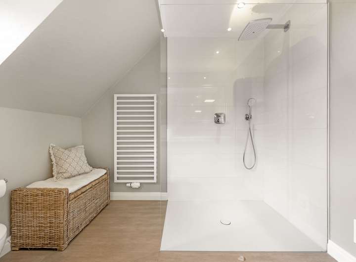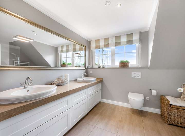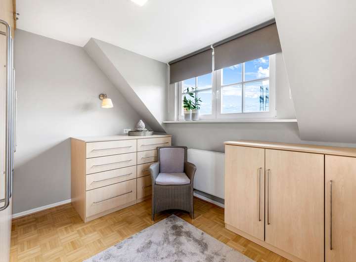 Im Dachgeschoss bietet das Haus ein großes Hauptschlafzimmer mit angrenzender Ankleide, zwei weitere Räume, die als Kinder-, Arbeits- oder Gästezimmer genutzt werden können, sowie ein modernes Tageslichtbad mit zwei Waschtischen, einer ebenerdigen Dusche und Einbauschränken. Der Teilkeller umfasst einen Vorratsraum, einen Fitnessraum sowie den Heizungsraum mit Platz für Waschmaschine und Trockner.