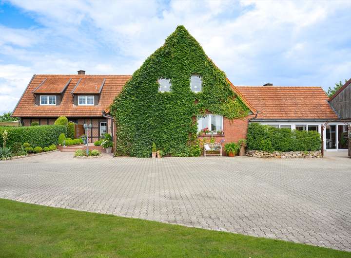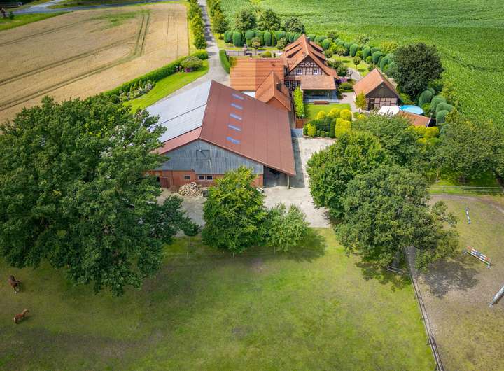 Die Hofstelle umfasst zwei Wohnhäuser auf einer weitläufigen Fläche von 8.976 m² mit vielfältigen Möglichkeiten für Wohnen, Arbeiten und Tierhaltung. Das ursprüngliche Wohnhaus aus dem Jahr 1956 wurde 1999 durch ein weiteres Wohngebäude ergänzt. Die Verbindung aus klassischer Bauweise und zeitgemäßer Ausstattung schafft flexible Nutzungsspielräume. Neben den Wohnhäusern stehen Wirtschaftsflächen sowie gepflegte Außenanlagen bereit.