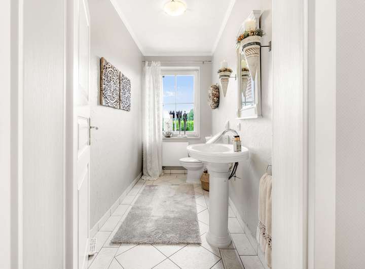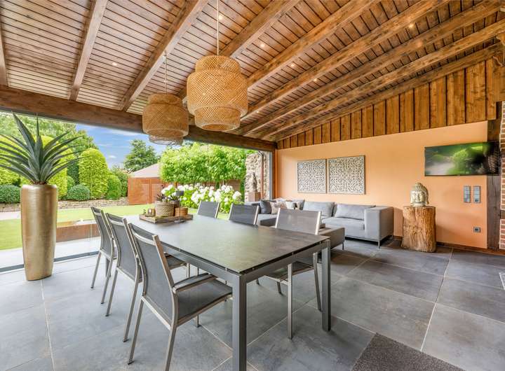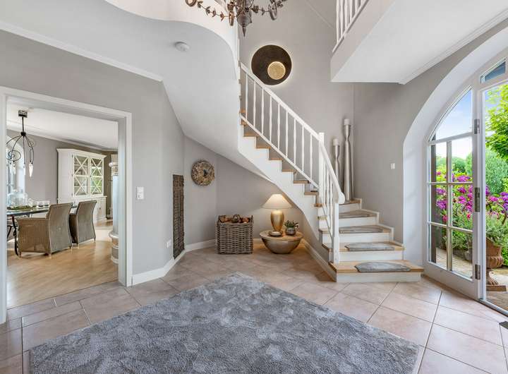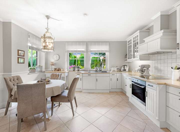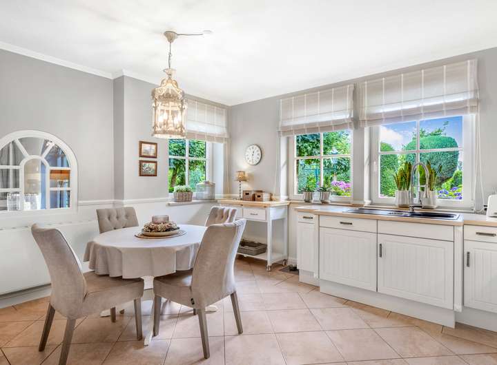 Im Erdgeschoss befinden sich ein offenes Foyer mit Garderobenbereich, ein helles Wohn-/Esszimmer mit Kachelofen und Terrassenzugang sowie eine Küche im Landhausstil mit Frühstücksecke (Einbauküche im Kaufpreis enthalten). Ein 2021 stilvoll gestalteter Sommergarten erweitert den Wohnbereich. Ein Gäste-WC vervollständigt diese Ebene.