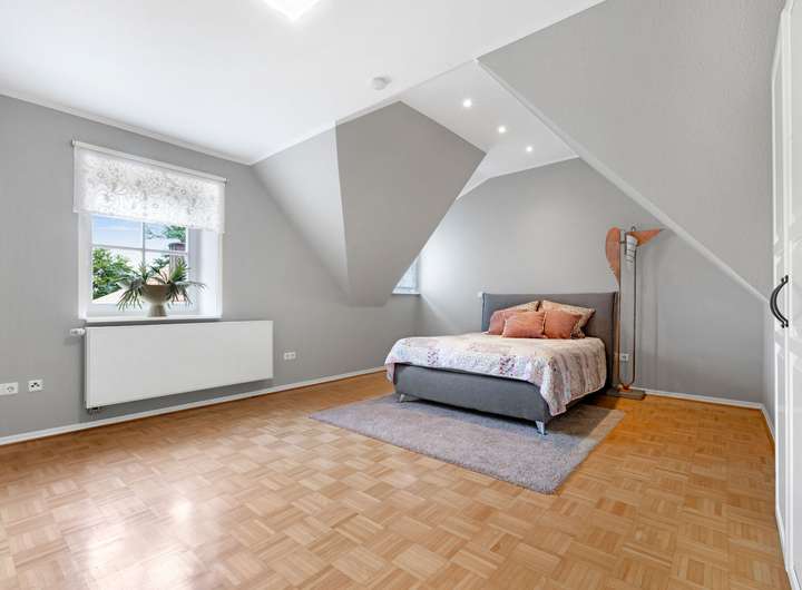 Im Obergeschoss stehen drei weitere Zimmer zur Verfügung, die vielseitig nutzbar sind. Der Spitzboden ist über eine Bodeneinschubtreppe zugänglich. Der Teilkeller umfasst einen Vorratsraum sowie den Heizungsraum.