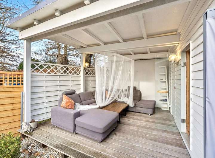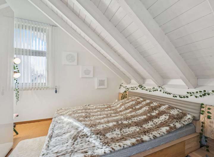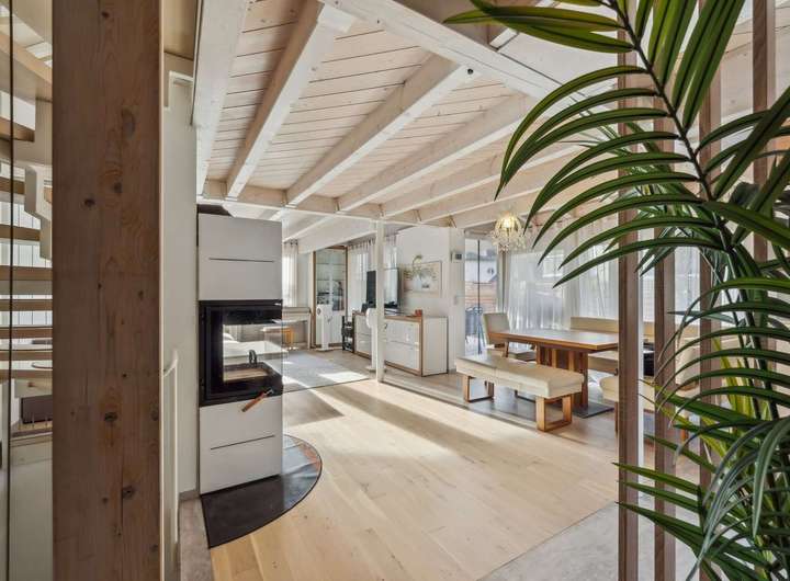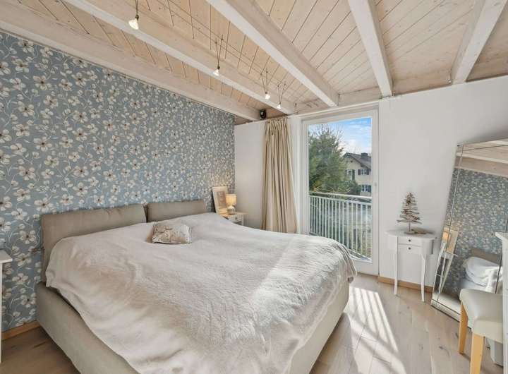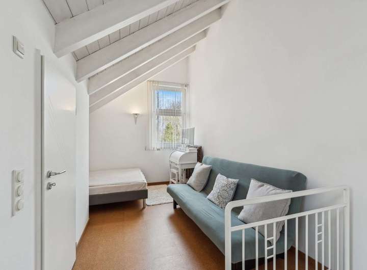 Es umfasst vier Schlafzimmer, ein großes Wohnzimmer mit gemütlichem Schwedenofen und öffnet sich zu einem lichtdurchfluteten Garten.
