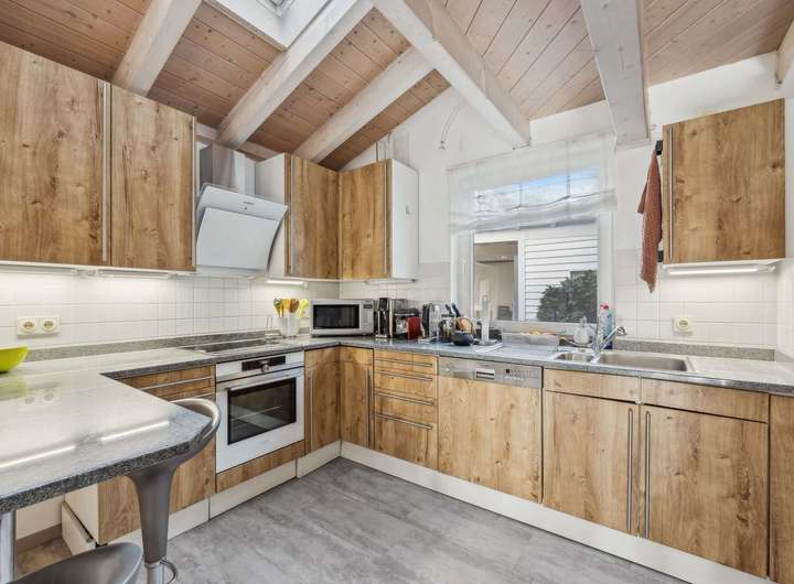 Die moderne Einbauküche mit Holzoptik-Fronten ist perfekt ausgestattet und ein Paradies für Hobbyköche.