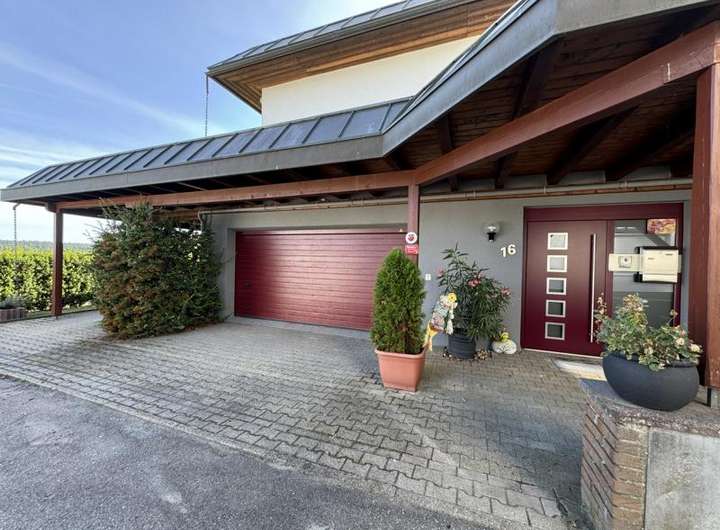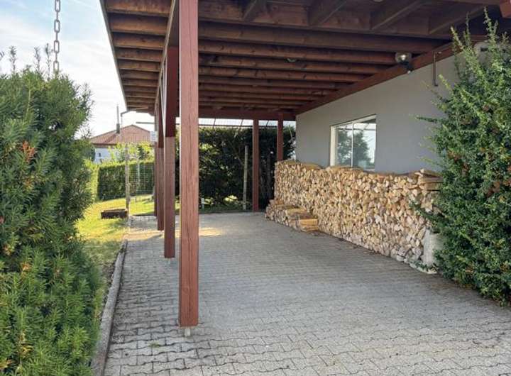 Zu den weiteren bemerkenswerten Eigenschaften zählen die Doppelgarage mit einem großen elektrischen Garagenrolltor, das einen direkten Zugang zum Gebäude ermöglicht. Zusätzlich steht ein überdachtes Doppelcarport zur Verfügung, unter dem sich, wie bereits erwähnt, die Zisterne befindet.