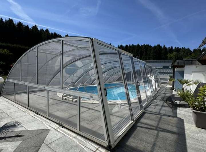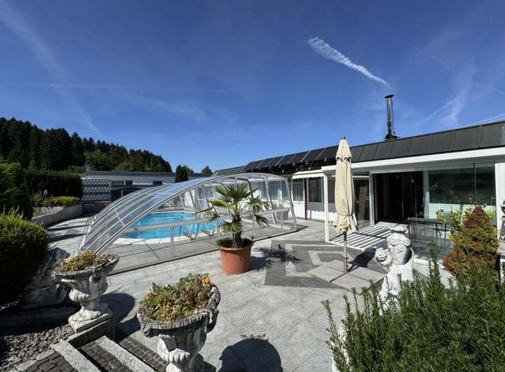 Die Immobilie besticht durch eine hochwertige Ausstattung sowie eine gepflegte Außenanlage mit massiv gebautem Schwimmbad von circa 48 m³, das vermutlich im Jahr 2009 errichtet wurde. Die Umrandung des Schwimmbads besteht aus edlem Granit, zudem ist eine Überdachung vorhanden, welche das Schwimmen sowohl mit als auch ohne Dach ermöglicht.