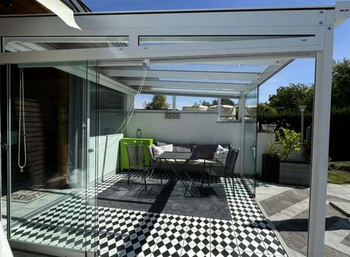 Im Garten befinden sich zwei Gartenhäuser, ein Raum für die Schwimmbadtechnik, ein Abstellraum, eine Außendusche sowie Zugänge zum Flachdach und zur angrenzenden Freilandfläche.