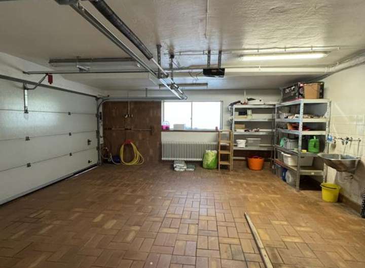 Eine weitere Tür öffnet den Zugang zur großzügigen Werkstatt, die über eine weitere Tür an den Heizungsraum mit angrenzenden Öltanks angrenzt. Vom Heizungsraum gelangt man zurück in den Flur, sodass eine Rundweg möglich ist.