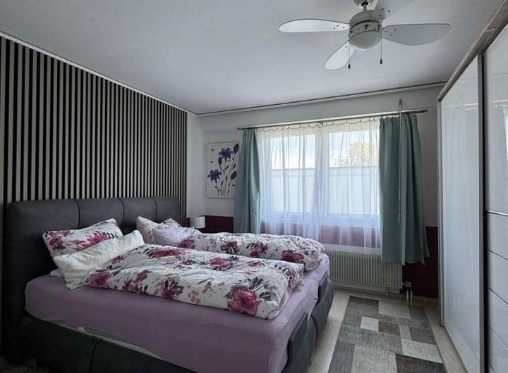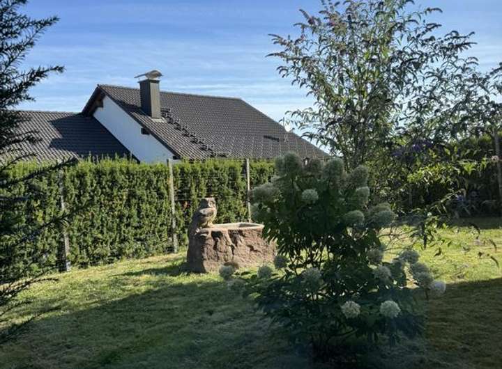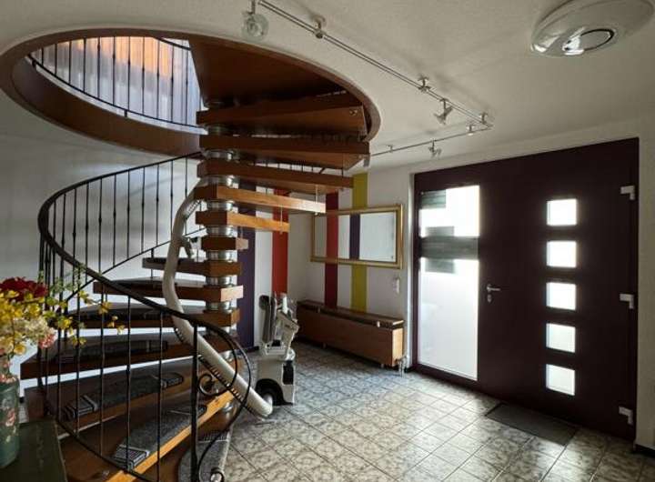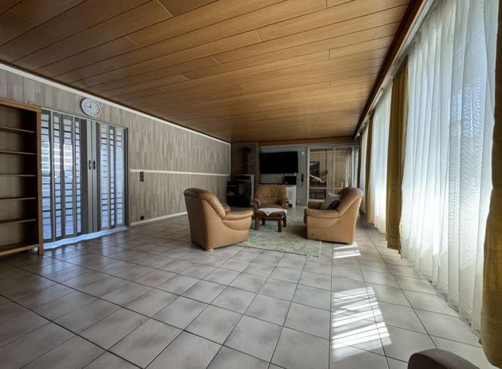 Dazu zählen die Dachsanierung mit 40 cm Isolierung, die Erneuerung der Einbauküche, Haustür und einiger Zimmertüren, die Badsanierung sowie der Anbau eines Wintergartens mit Verschattung. Zudem wurde ein Teich mit Sandsteinbrunnen angelegt, die Heizung auf einen Brennwertkessel umgestellt, ein Schwedenofen mit Edelstahlkaminaufsatz installiert und zuletzt wurden die Fenster im Obergeschoss mit dreifacher Verglasung sowie elektrischem Rollladen im Wohnzimmer ausgestattet.
