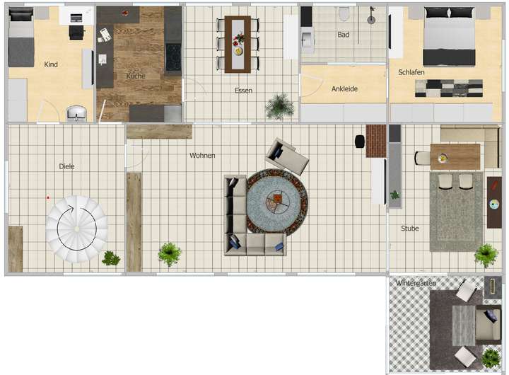 In der Diele sind die Garderobe sowie die Wendeltreppe zum Obergeschoss untergebracht.