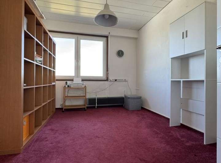 Schräg gegenüber des Haupteingangs führt ein Türbogen in den Flur, der Zugang zu verschiedenen Räumen bietet: links zur Doppelgarage, rechts zu einem großzügigen Vorratsraum. Weiter geradeaus links gelangt man in den Wohnbereich, der in den Plänen als Gästezimmer mit Bad ausgewiesen ist und einen schönen Ausblick bietet. Von hier aus führt eine Tür weiter ins Büro. Dieser Einliegerbereich kann auch für ein Mehrgenerationenwohnen genutzt werden.
