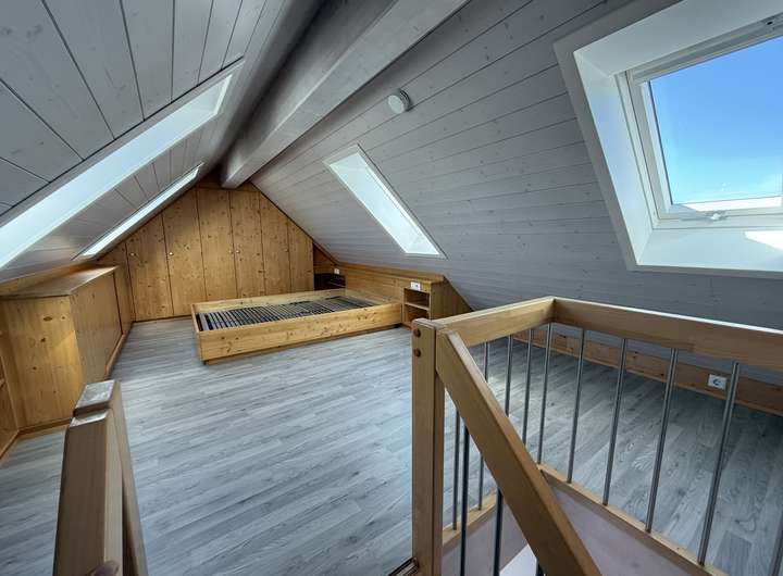 - neuer moderner Laminat im offenen Schlafraum im Spitzboden