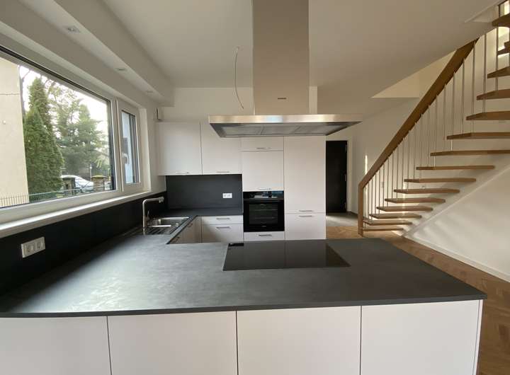 Die Küche ist mit einer Einbauküche mit elektrischen Markengeräten der Firmen Siemens und Liebherr ausgestattet. Zahlreiche Ober- und Unterschränke sorgen für reichlich Stauraum.