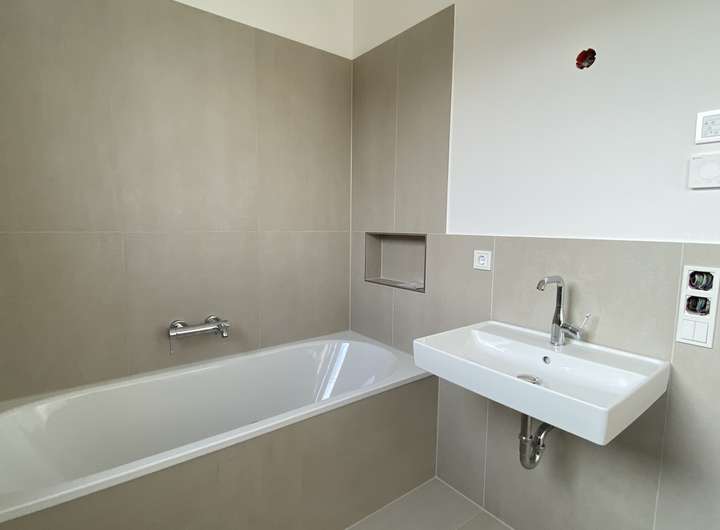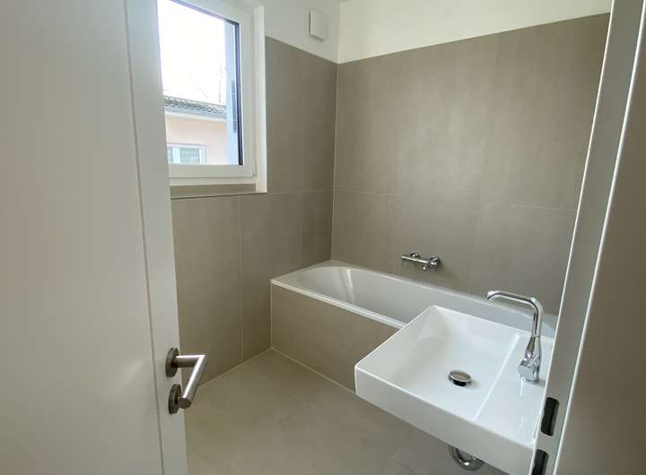 Das Badezimmer im ersten Stock verfügt eine Badewanne mit eingelassener Ablagefläche, einem Waschbecken und ein Hänge WC sowie Waschmaschinen Anschluss.