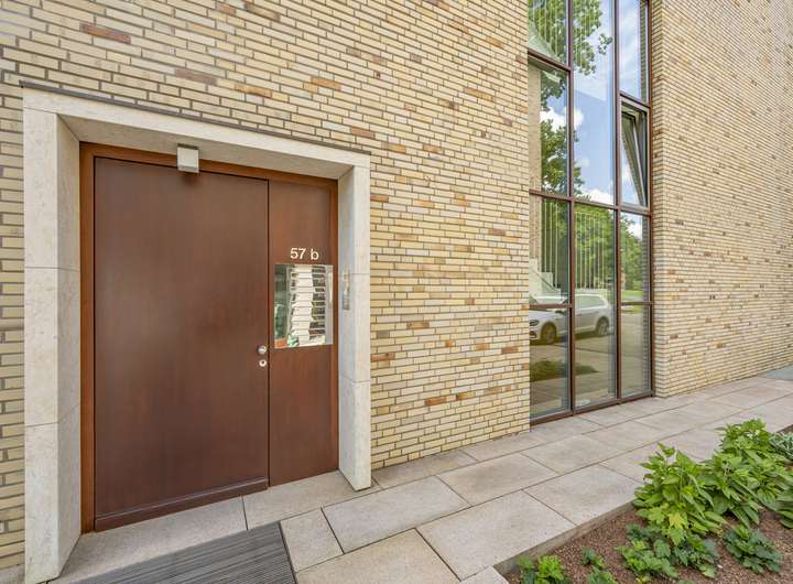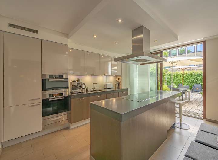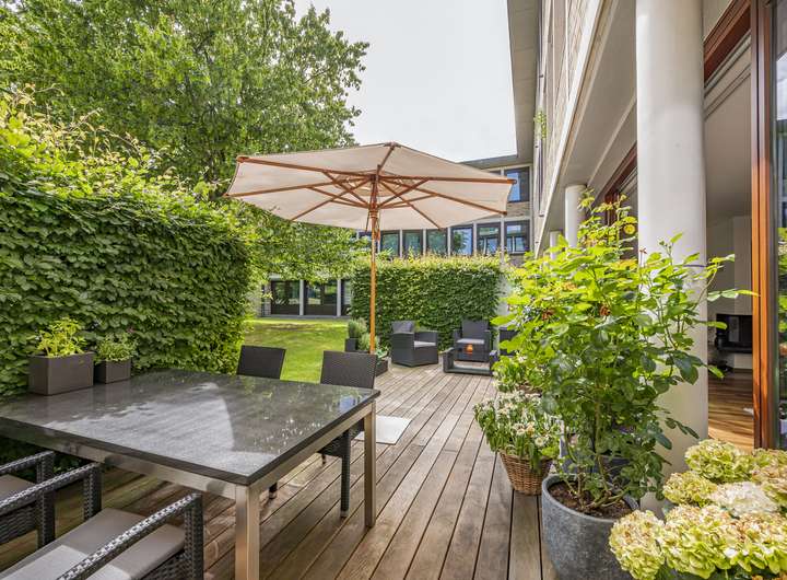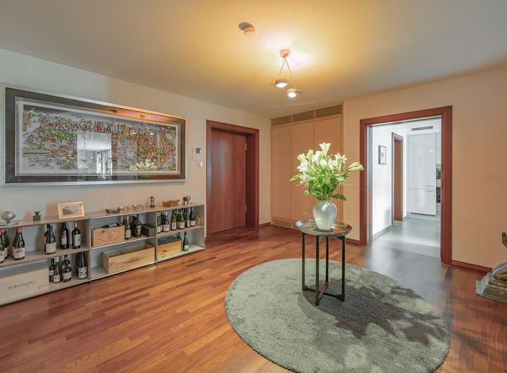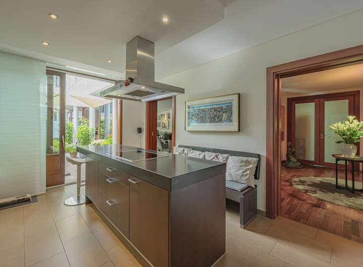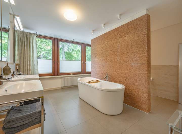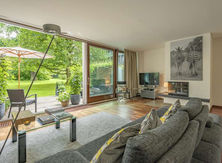 Über ein großzügiges Entrée betritt man das ca. 62 m² große Wohn- und Esszimmer mit bodentiefen Fenstern und Kamin. Eine große Schiebetür öffnet den Zugang zur Südterrasse mit Blick ins Grüne. Die moderne Poggenpohl-Küche mit Miele-Geräten ist separiert, lässt sich aber durch eine Schiebetür öffnen. Ein Abstellraum mit Einbauschränken ergänzt das Platzangebot.