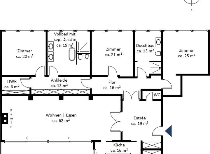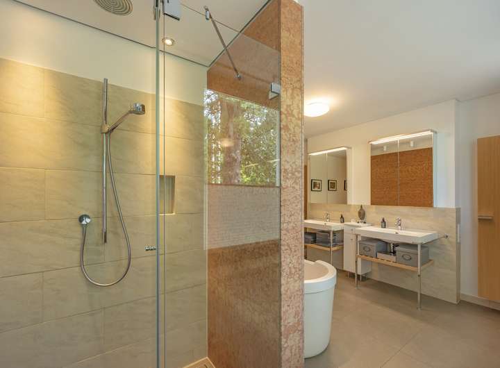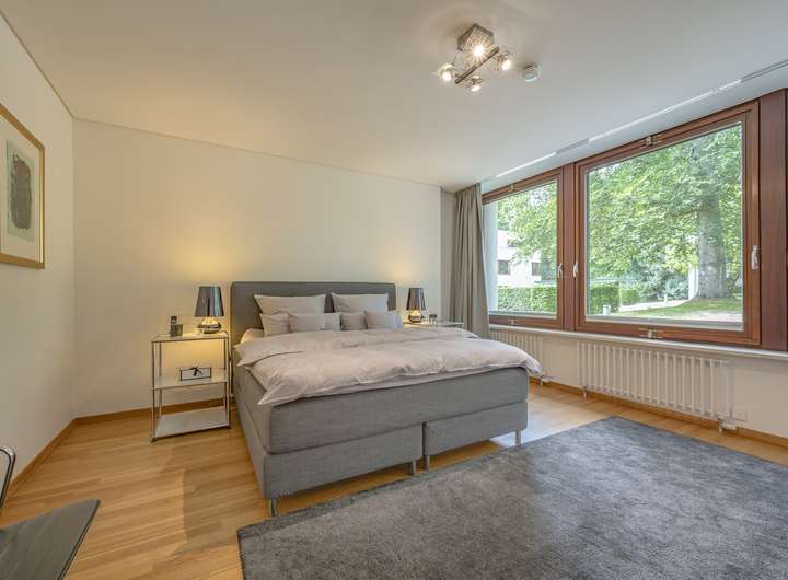 Die Schlafzimmer sind geschickt vom Wohnbereich getrennt. Das Hauptschlafzimmer verfügt über eine Ankleide mit Einbauschränken und ein hochwertiges Bad mit freistehender Wanne, Doppelwaschbecken und separater Dusche. Zwei weitere Zimmer dienen flexibel als Kinder-, Arbeits- oder Gästezimmer. Ein zweites Bad rundet den Grundriss ab.