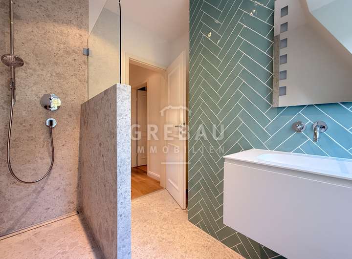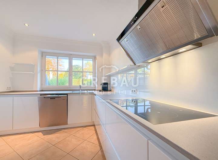 - große Wohnküche mit eleganter, exklusiver Kücheneinrichtung von next125, u.a. mit Induktionsherd, Dampfgarer, Backofen, Geschirrspüler, Kühlschrank, Dunstabzug (überwiegend Siemens u. Miele) sowie Dekton-Arbeitsplatte und Schiebetür zum Essbereich