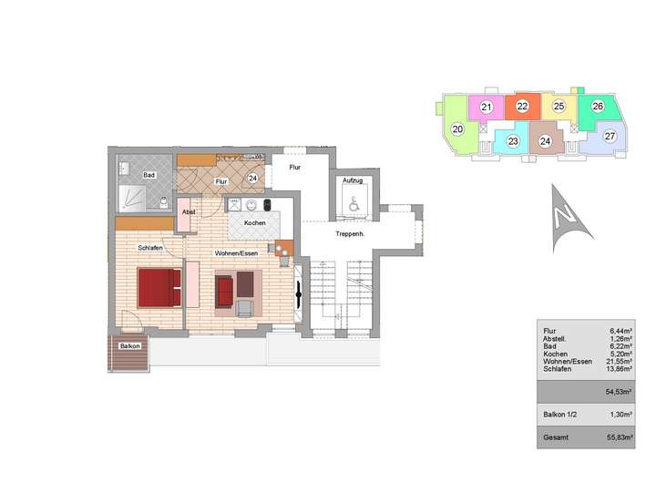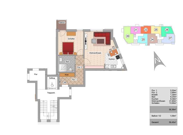 Ein geräumiger Flur, ein Schlafzimmer, ein Badezimmer, sowie ein offener Wohn- und Küchenbereich mit Balkon umrunden die Wohnung.